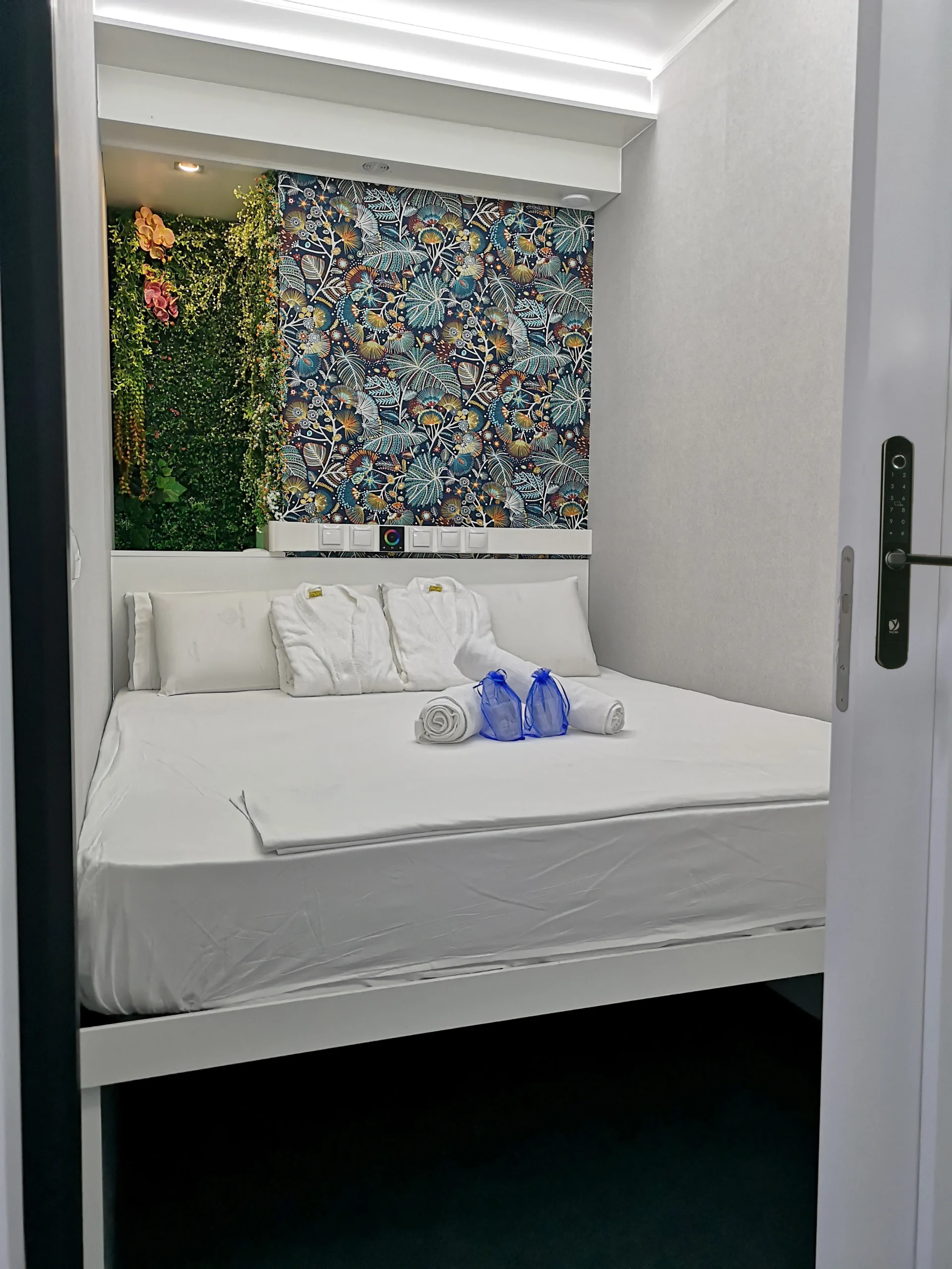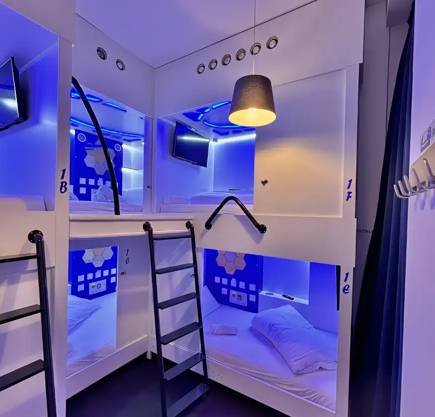 Habitaciones y módulos diseñados para su confort y privacidad en el corazón de Madrid. Con Smart TV, Wi-Fi rápido, climatización y almacenamiento seguro, desde módulos individuales hasta Doble Deluxe XXL. Funcionales, modernos y acogedores, perfectos para descansar, trabajar o relajarse.