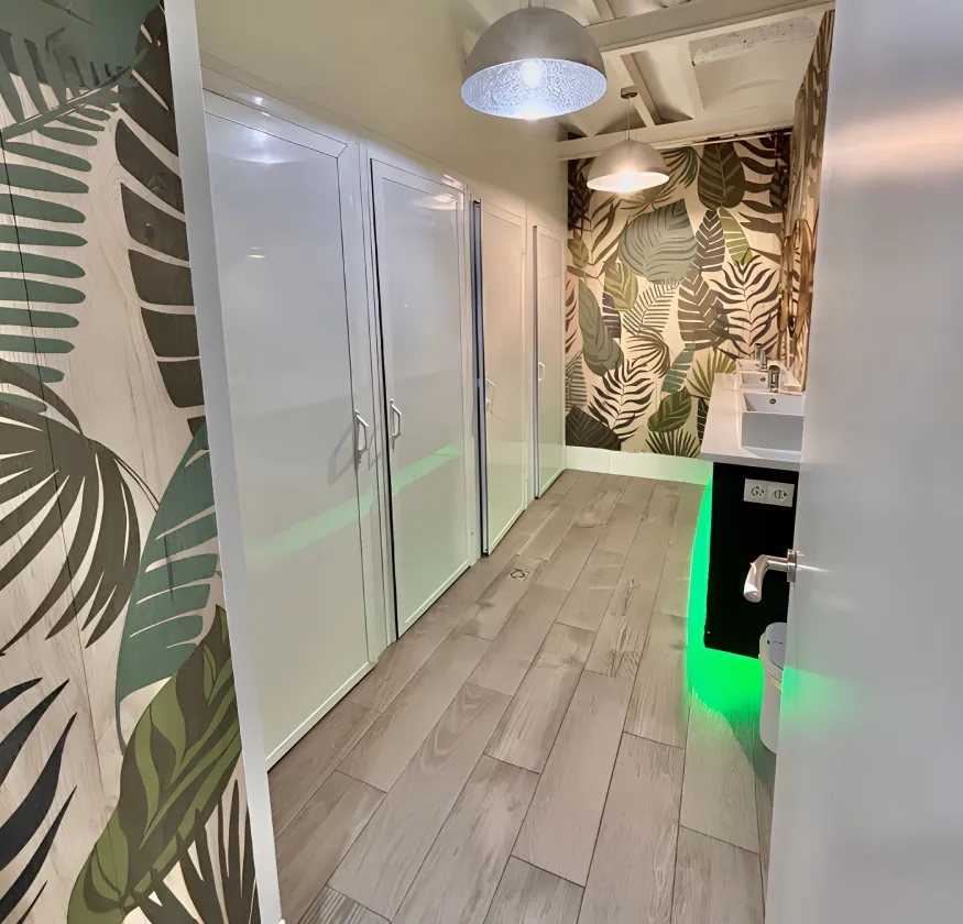Los baños compartidos de nuestras mini habitaciones le ofrecen cabinas de ducha con hidromasaje, iluminación ambiental y gel y champú de cortesía. Gracias a la desinfección constante por ozono, el espacio se mantiene limpio y seguro, creando un entorno moderno y cuidado para una experiencia refrescante y relajante.