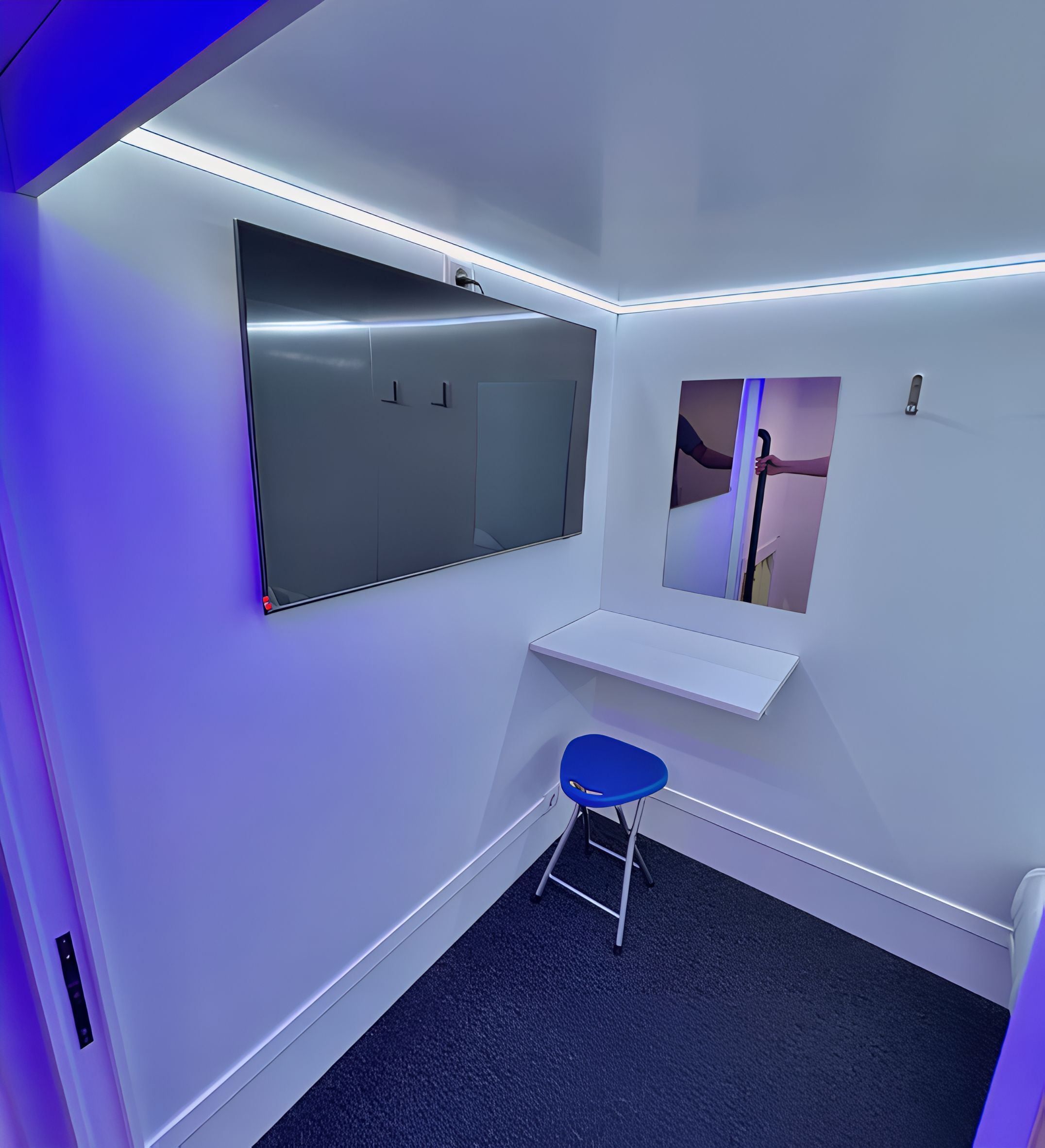 Habitación pequeña y moderna con cama doble y luces LED azules.