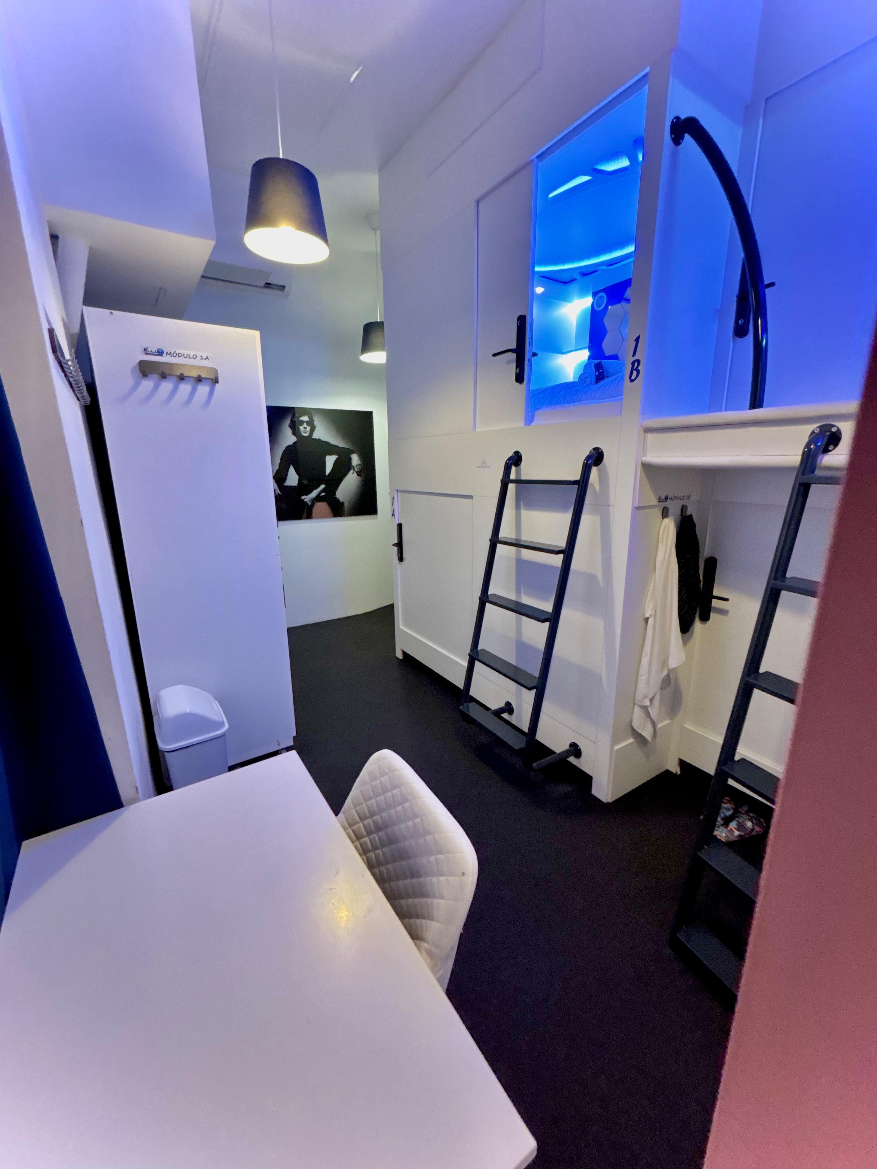 Disfruta de una cama de matrimonio en un espacio privado dentro de una habitación compartida con 6 módulos. Equipado con Smart TV, WiFi de alta velocidad, aire acondicionado y aislamiento acústico para un descanso óptimo. Ideal para parejas que buscan una estancia económica sin renunciar a la privacidad y el confort.