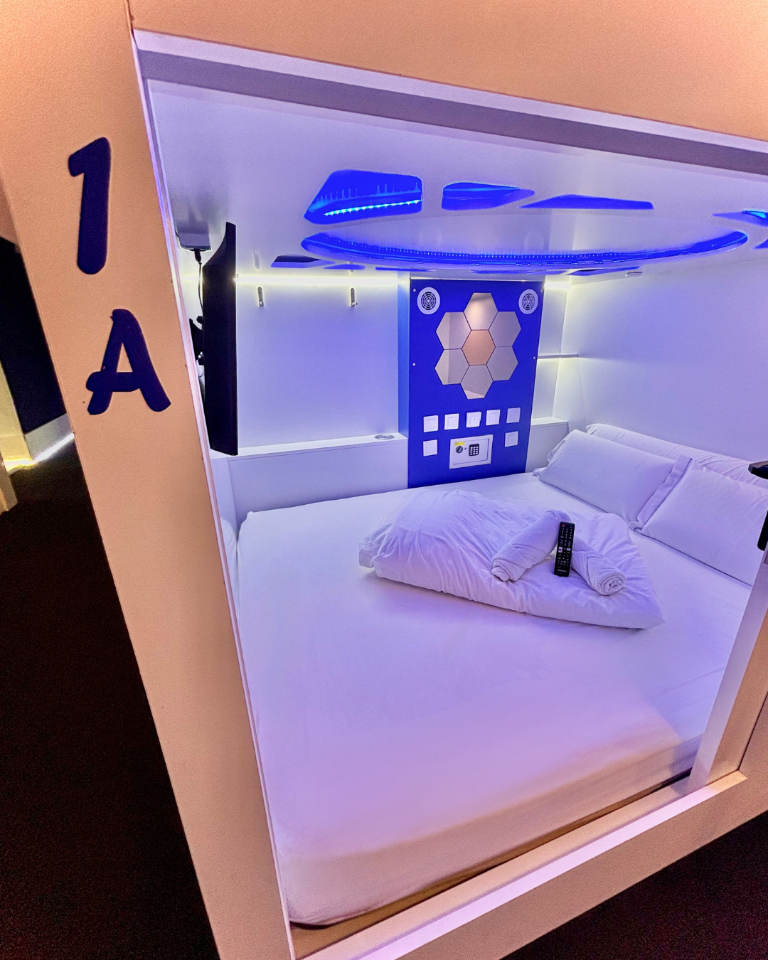 Cápsula futurista iluminada en azul con cama, pantalla y paneles hexagonales.